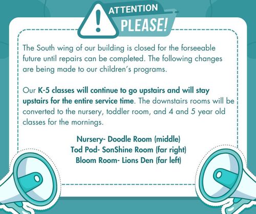 Due to the flooding last week, the South wing of our building will be closed for the foreseeable future while repairs are being done. Going forward, our K-5 classes will continue to go upstairs and stay upstairs for the entire service. Our downstairs classrooms will be converted into the nursery, toddler room, and 4 and 5 year old classes for Sunday mornings.